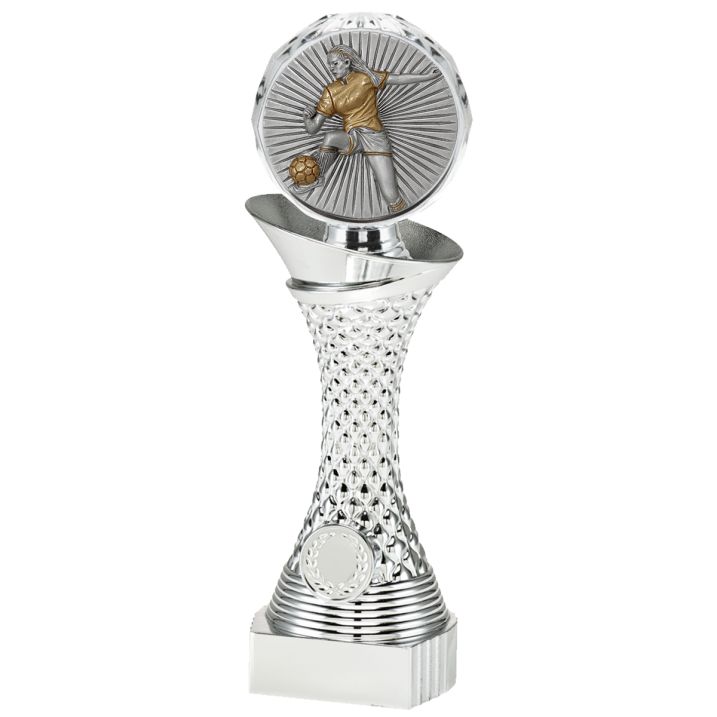 Deze zilverkleurige voetbal trofee is bij Boccale verkrijgbaar in drie verschillende maten. Op de bovenzijde van het beeld bevindt zich een voetbal-disc, waardoor deze trofee ideaal is voor voetbaltoernooien, teamprijzen of individuele onderscheidingen voor speelsters. Aan de onderkant van de trofee is ruimte voor een eigen afbeelding én een persoonlijk tekstplaatje. U kunt eenvoudig een eigen ontwerp uploaden of kiezen uit een van onze beschikbare afbeeldingen. Boccale verzorgt de montage van de afbeelding en het tekstplaatje gratis.