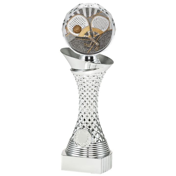 Deze zilveren trofee is in 3 maten beschikbaar bij ons. Er zit een mooie padel disc op de bovenkant van de trofee, en aan de onderkant is er ruimte voor een eigen afbeelding én een tekstplaatje! Voor de afbeelding kan je een eigen ontwerp uploaden. Of een van onze afbeeldingen kiezen. De montage van de trofee wordt gratis gedaan door ons. Speciaal ontworpen voor padel Hoge kwaliteit Persoonlijke tekst mogelijk.
