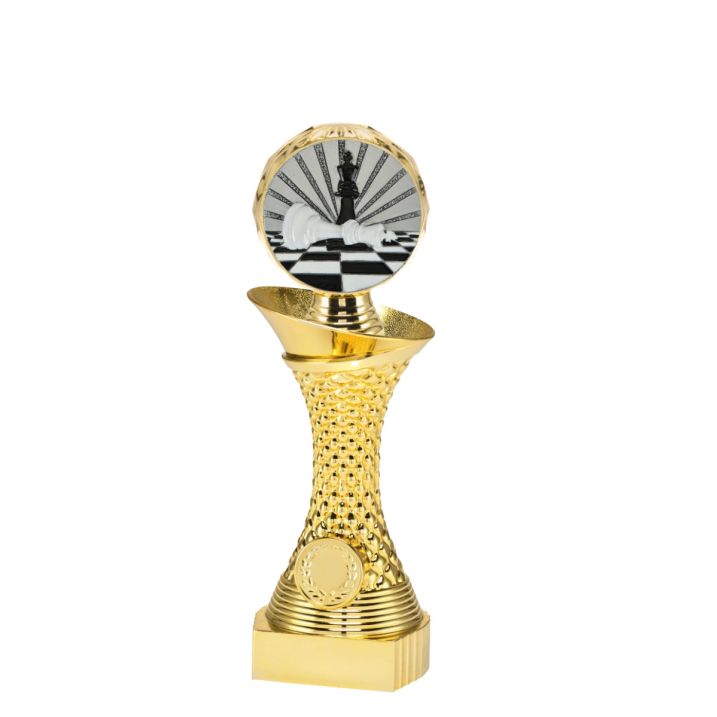 Deze gouden trofee is in 3 maten beschikbaar bij Budgettrophy. Er zit een mooie schaak disc op de bovenkant van de trofee, en aan de onderkant is er ruimte voor een eigen afbeelding én een tekstplaatje! Voor de afbeelding kan je een eigen ontwerp uploaden. Of een van onze afbeeldingen kiezen. De montage van de trofee wordt gratis gedaan door Budgettrophy. ✓ Speciaal ontworpen voor schaken ✓ Hoge kwaliteit ✓ Persoonlijke tekst mogelijk