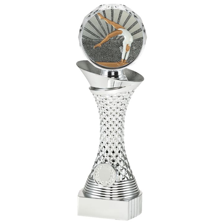 Deze zilveren trofee is in 3 maten beschikbaar bij ons. Er zit een mooie turn disc op de bovenkant van de trofee, en aan de onderkant is er ruimte voor een eigen afbeelding én een tekstplaatje! Voor de afbeelding kan je een eigen ontwerp uploaden. Of een van onze afbeeldingen kiezen. De montage van de trofee wordt gratis gedaan door ons. Speciaal ontworpen voor turnen Hoge kwaliteit Persoonlijke tekst mogelijk.