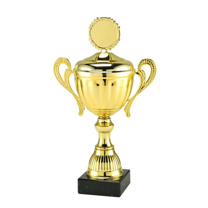 Deze gouden trofee heeft Budgettrophy in acht verschillende maten op voorraad. De maten lopen op van 27,5cm t/m 42,5cm. De gouden trofee is bevestigd op een zwart marmeren blok en biedt de mogelijkheid om een (sport)afbeelding toe te voegen in de center op de deksel. Daarnaast kan er een tekstplaatje op de voet bevestigd worden met jouw eigen persoonlijke tekst. Budgettrophy voert de montage van de afbeelding en het tekstplaatje gratis voor je uit! Kijk ook eens naar een bokaal?