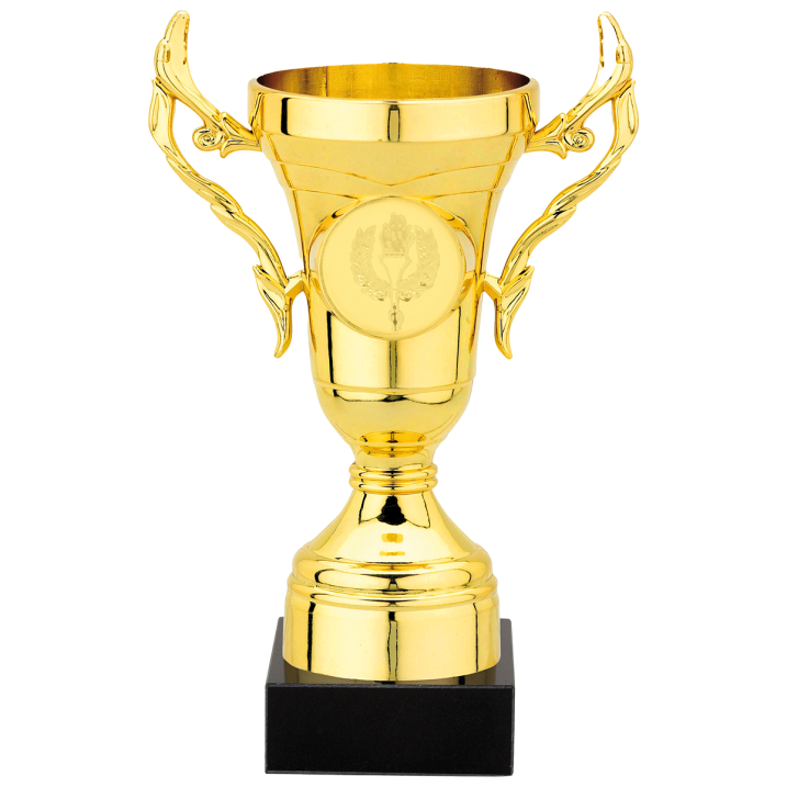 Deze gouden kleine Budget Trophy is direct uit voorraad leverbaar bij Budgettrophy. Met een hoogte van 15,5 cm is deze trofee perfect voor elk (sport)toernooi of als beloning voor de kleine winnaars tijdens een sportdag of evenement. U kunt de trofee personaliseren door een eigen afbeelding toe te voegen in het midden, of een keuze te maken uit het brede assortiment van Budgettrophy. Daarnaast kunt u een tekstplaatje met uw eigen tekst laten bevestigen op de voet van de trofee. Budgettrophy zorgt gratis voor de montage van zowel de afbeelding als de tekst!