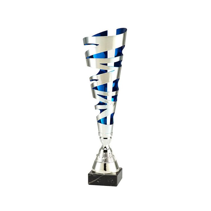 De Nova trofee in zilver en blauw is een opvallende beker met een moderne en luxe uitstraling. Door de combinatie van glanzend zilver en diepblauwe details is deze trofee een echte blikvanger in iedere prijzenkast. De trofee is verkrijgbaar vanaf 35,5 cm en daardoor perfect geschikt voor grotere wedstrijden, finales of bijzondere prestaties.