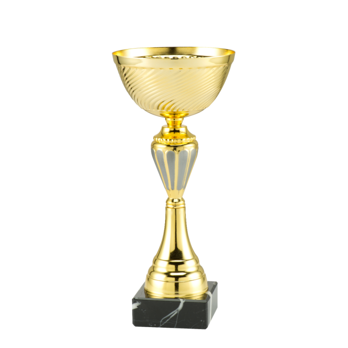Deze gouden trofee is bij Budgettrophy in 12 verschillende maten beschikbaar. Ideaal als u een trofee zoekt in verschillende hoogtes. Op het middenstuk zitten mooie grijzen details. Op de zwarte voet kan een tekstplaatje worden bevestigd om de trofee extra persoonlijk te maken.