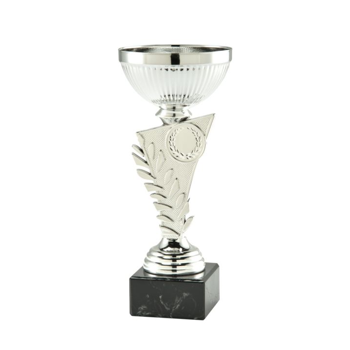 Deze zilveren trofee heeft ene luxueuze uitstraling doormiddel van het mooie middenstuk. Op dit middenstuk kan ook een afbeelding worden geplaatst, waardoor de trofee geheel naar smaak te maken is. Op de zwarte marmeren voet kan een tekstlabel worden geplaatst om de trofee nóg persoonlijker te maken.