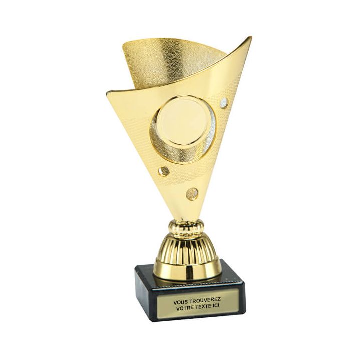 Deze stijlvolle waaier trofee is verkrijgbaar in goud, zilver en brons en heeft een hoogte van 15,5 cm. In het midden van de beker is ruimte voor een rond embleem naar keuze. Je kunt eenvoudig je eigen afbeelding uploaden of een selectie maken uit onze uitgebreide collectie sport- en themagerelateerde afbeeldingen.