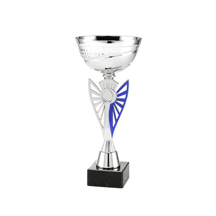 Deze zilveren trofee heeft Budgettrophy in zes verschillende maten. Het middenstuk heeft blauwe details en ruimte voor het toevoegen van een afbeelding. Je kan kiezen uit een afbeelding uit onze catalogus of een eigen design uploaden. Ook kan op de marmeren voet een tekstplaatje worden bevestigd met een eigen tekst.