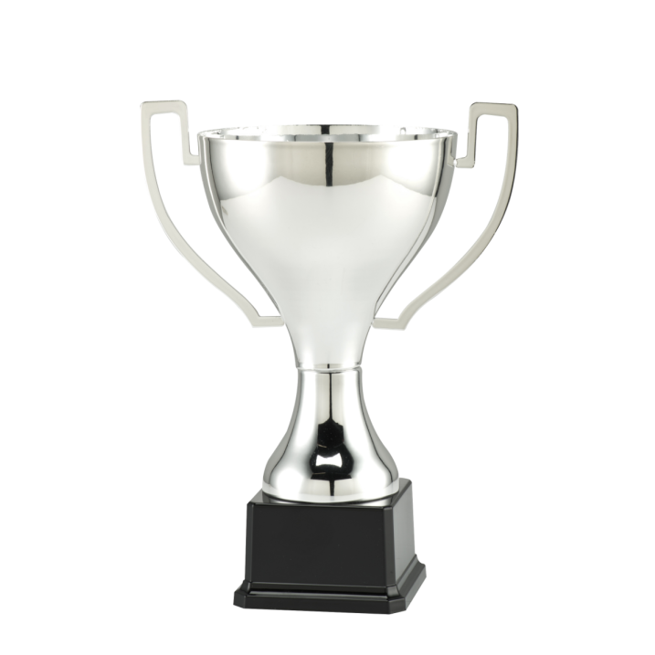 Deze zilveren trofee heeft de traditionele oren aan de zijkant! Hierdoor kan hij mooi omhoog gehouden worden. Hij is verkrijgbaar in 3 verschillende maten. Op de grote, zwarte voet kan een tekstplaatje worden geplaatst, dat gratis wordt gemonteerd door Budgettrophy!