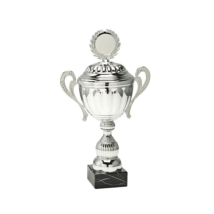 Zilveren winnaarstrofee Vigga - met deksel, handvat, marmeren voet & embleemhouder - 8 maten (25,5-43 cm)